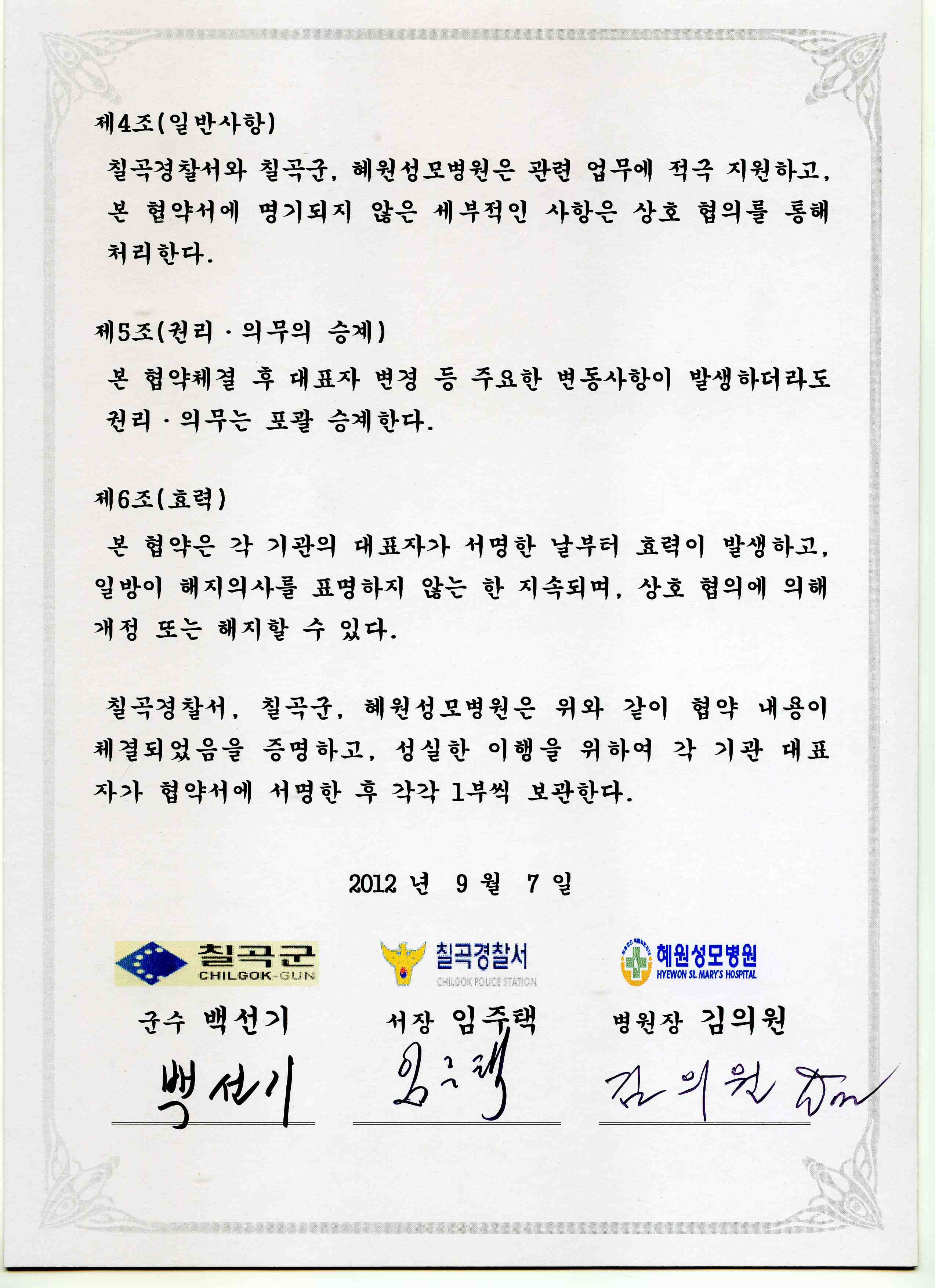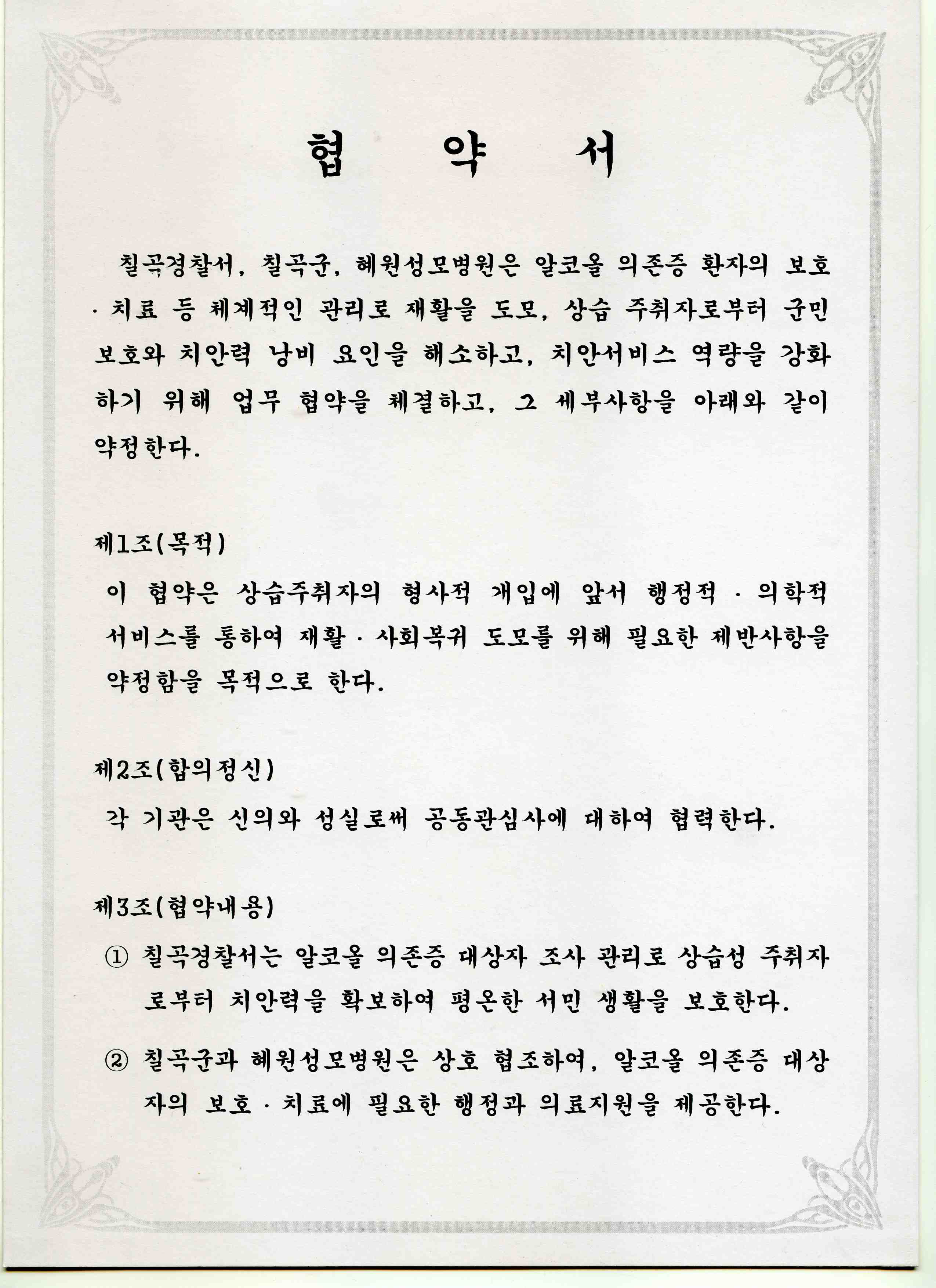 - 칠곡경찰서, 칠곡군, 혜원성모병원은 알코올 의존증 환자의 보호,치료 등 체계적인 관리로 재활을 도모, 상습 주취자로부터 군민 보호와 치안력 낭비 요인을 해소하고, 치안서비스 역량을 강화 하기 위해 업무 협약을 체결.